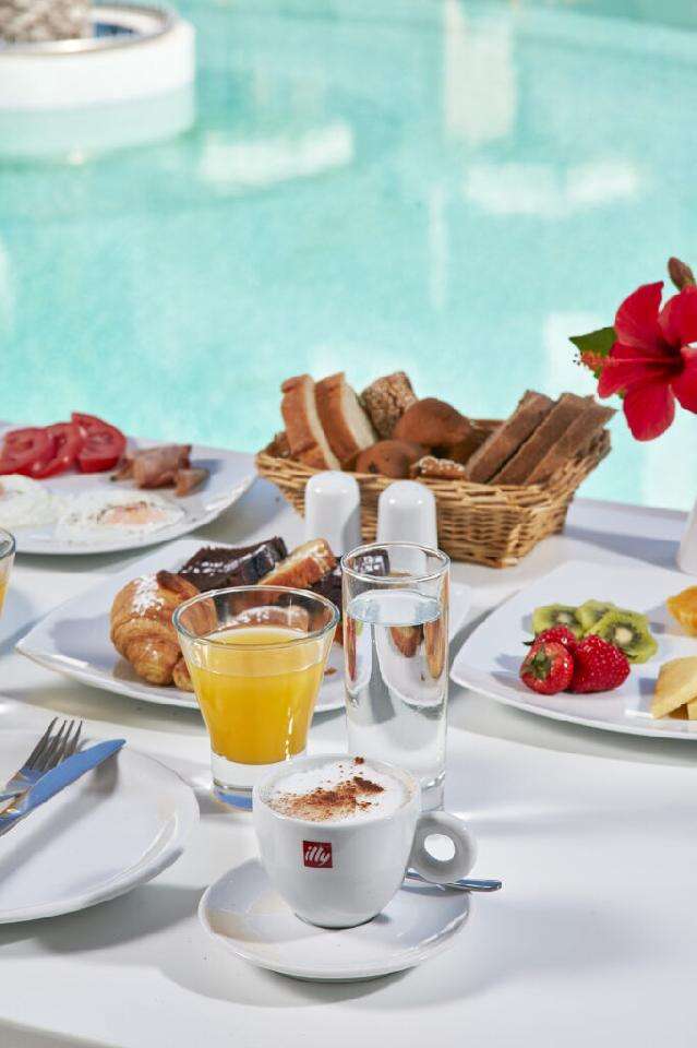 A szálloda foglalható reggelis vagy félpanziós ellátással. A büféreggelit a hotel éttermében szolgálják fel, ahol hideg és meleg ételek, friss pékáruk, gyümölcsök és italok széles választéka várja a vendégeket. Félpanzió esetén a vacsora svédasztalos rendszerben történik, görög és nemzetközi fogásokkal.
