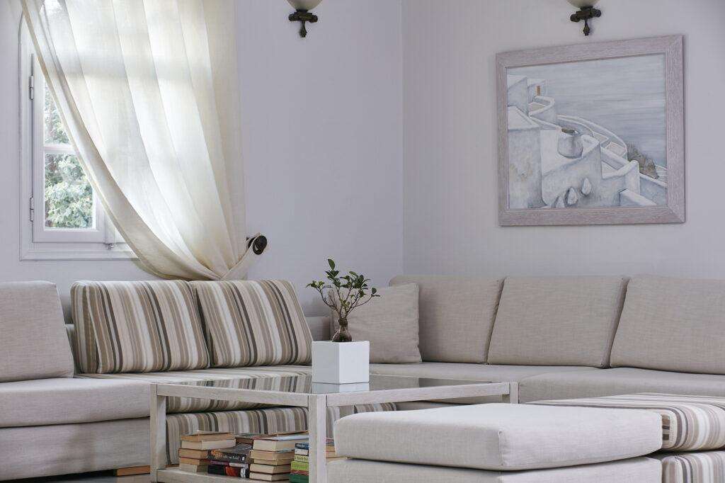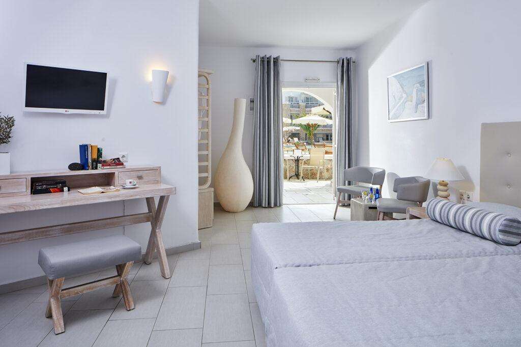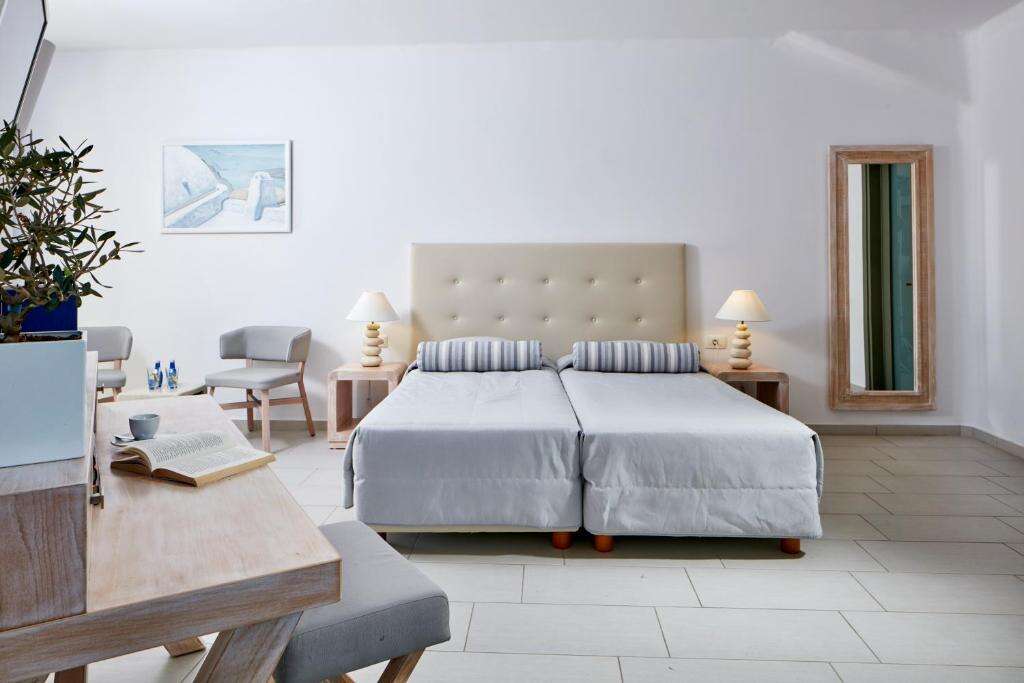 A hotel tágas, kényelmesen berendezett, légkondicionált szobákat kínál, amelyek a hagyományos görög stílus jegyeit viselik magukon. A szobák saját fürdőszobával, hajszárítóval, televízióval, telefonnal, hűtőszekrénnyel/minibárral, széffel és ingyenes Wi-Fi-hozzáféréssel felszereltek. A legtöbb szobához erkély vagy terasz tartozik, kilátással a medencére vagy a szálloda belső kertjére.